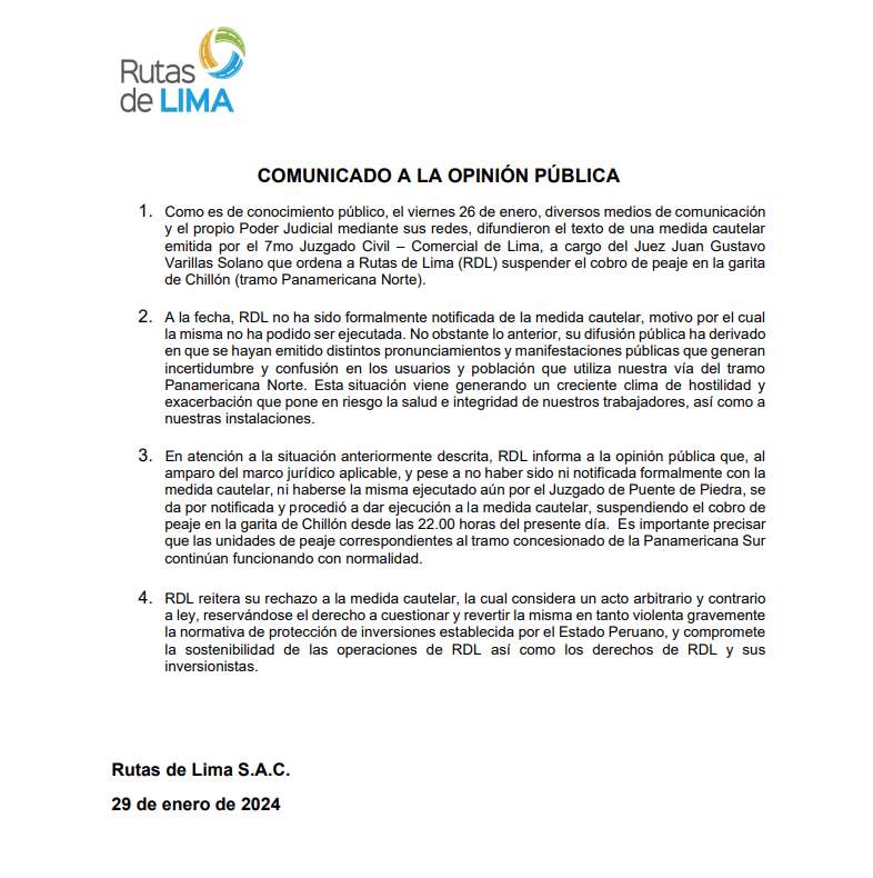 La empresa Rutas de Lima comunicó la suspensión del cobro de peajes en las garitas de Chillón, ubicadas en el kilómetro 25 de la Panamericana Norte, a partir del último 29 de enero a las 10 de la noche. Esta medida se toma en cumplimiento de una medida cautelar dispuesta por el Poder Judicial el 26 de enero, a solicitud de la Asociación Casa Huerta El Paraíso.