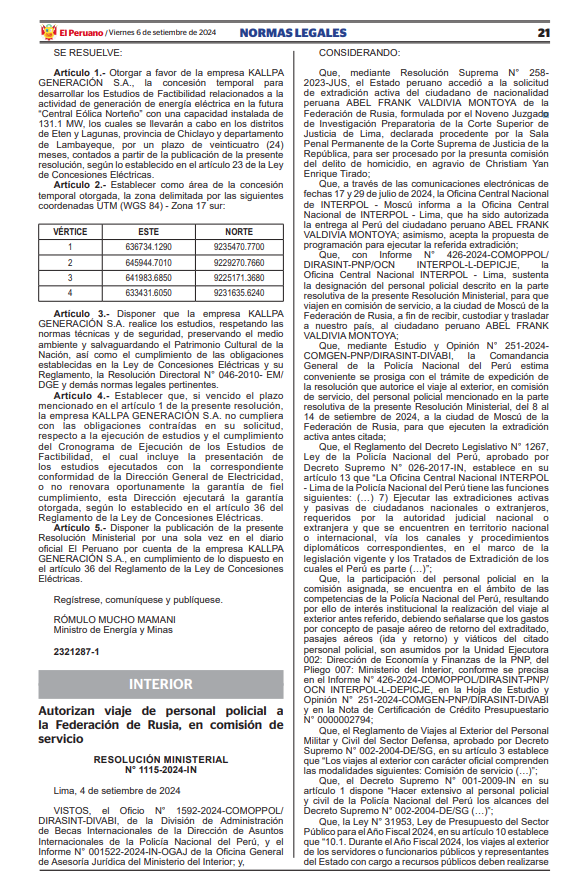 El Ministerio del Interior autorizó el viaje de personal de la Policía Nacional a Rusia desde el 8 al 14 de septiembre con el fin de ejecutar la extradición de Abel Valdivia Montoya, quien es acusado de asesinar a Christiam Enrique Tirado durante una fiesta a la que también asistió la congresista Rosselli Amuruz.