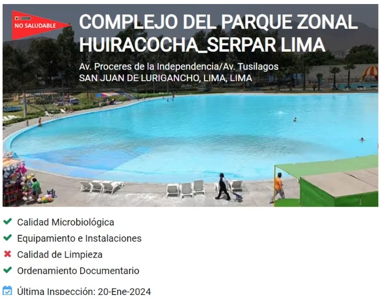 Según la Digesa, pese a que recientemente estuvo en mantenimiento para su reapertura, la playa artificial cumple con los requisitos de calidad microbiológica, equipamiento y ordenamiento documentario, pero no con el de calidad de limpieza.
