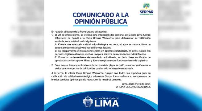 No obstante, señalan que la observación se limita a un área específica ubicada fuera de la zona.”La citada playa cumple con todos los aspectos para su calificación de calidad microbiológica adecuada. Serpar Lima reafirma su compromiso de brindar servicios óptimos“, se lee en parte del comunicado.