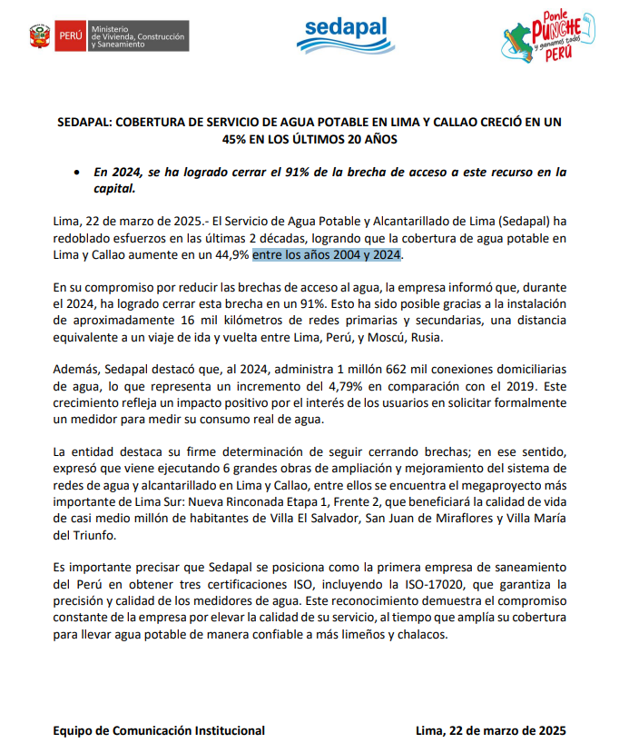 Tras el informe difundido por AFP, Sedapal compartió un comunicado en el que indicó que “cobertura de servicio de agua potable en Lima y Callao creció en un 45% entre los años 2004 y 2024”.