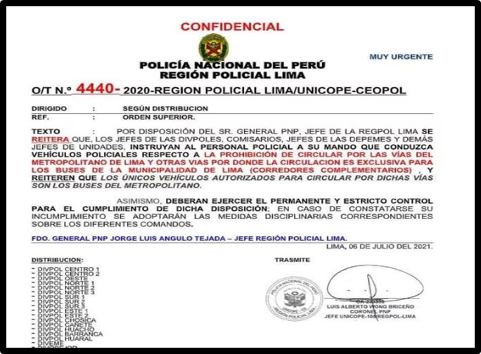 En julio del 2021, cuando el general Jorge Angulo Tejada estaba al mando de la jefatura de la Región Policial Lima, se emitió una disposición a las comisarías de Lima Metropolitana de instruir al personal para que no invadan las vías del Metropolitano. “Al personal policial […] la prohibición de circular por las vías del Metropolitano y otras vías [exclusivas para el transporte público]”, se lee en la disposición O/T N.° 440-2020-REGION POLICIAL LIMA / UNICOPE-CEOPOL