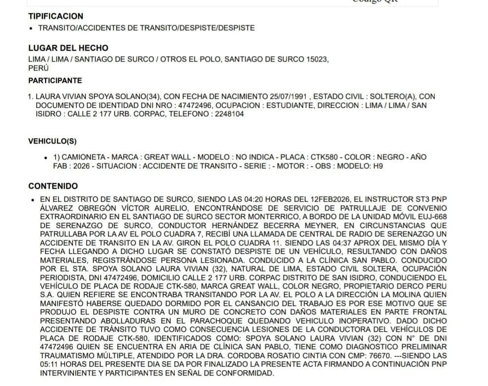 El informe señala que el efectivo PNP Víctor Álvarez Obregón acudió al lugar tras una alerta del serenazgo y constató el despiste del auto, conducido por la también figura del streaming. La propia Spoya indicó que el agotamiento habría provocado el siniestro.