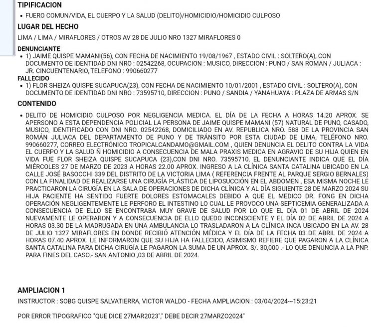 Según la denuncia, al día siguiente, la cantante notó dolores en el abdomen por lo que fue intervenida nuevamente en la clínica Santa Catalina, ya que tras la cirugía plástica realizada por el Dr. Víctor Fong, se detectó que su intestino estaba perforado, lo que le habría provocado una septicemia generalizada. En esta segunda intervención, la cantante quedó inconsciente.