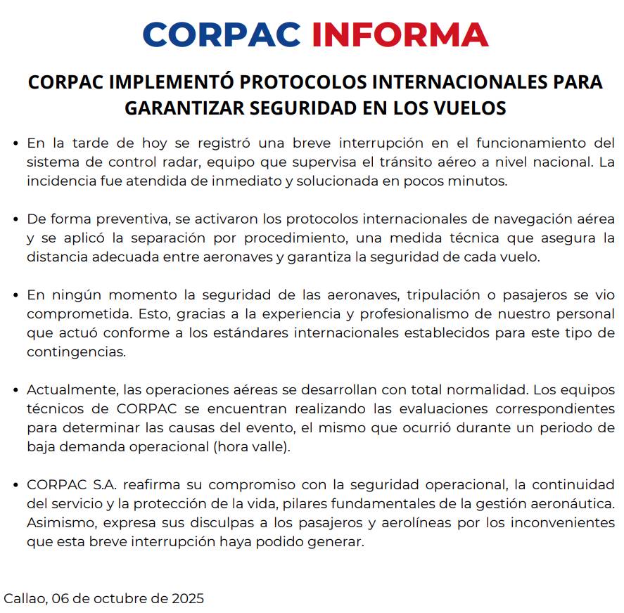 Asimismo, Corpac aseguró que la seguridad de las aeronaves, tripulaciones y pasajeros no estuvo comprometida en ningún momento. Cabe apuntar que las operaciones continuaron con normalidad mientras los técnicos resolvían la falla.