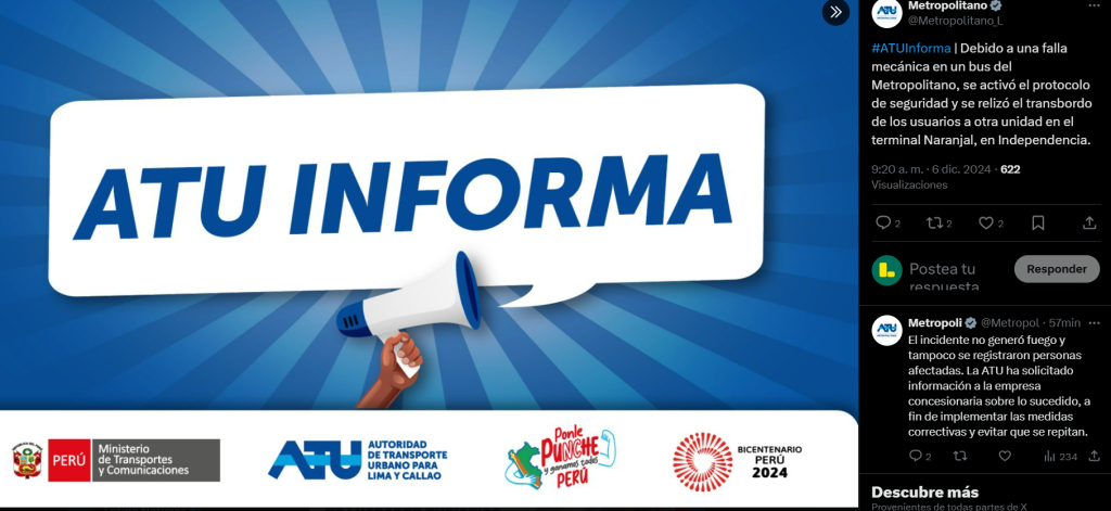 Sin embargo, descartaron que se haya generado fuego. “El incidente no generó fuego y tampoco se registraron personas afectadas. La ATU ha solicitado información a la empresa concesionaria sobre lo sucedido, a fin de implementar las medidas correctivas y evitar que se repitan”, detallaron en otro tuit.
