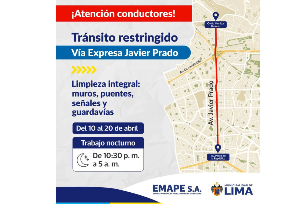 Toma tus precauciones. La Municipalidad Metropolitana de Lima, a través de Emape, informó que se restringirá el tránsito por la Vía Expresa Javier Prado debido a una operación de limpieza. Se trabajará en el lavado de muros interiores, guardavías, sardineles y señales verticales con la finalidad de eliminar las capas de suciedad en los 7 kilómetros de esta transitada autopista.