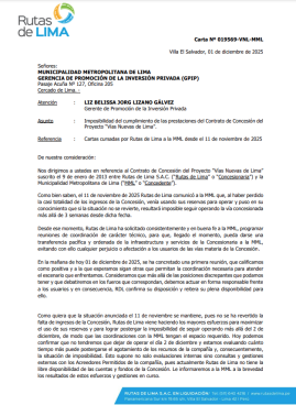 La empresa explicó que esta decisión llega tras una reunión con funcionarios del municipio, calificada como un diálogo “positivo”. En el documento, firmado por el liquidador Carlos Enrique Corbella Espinoza, se menciona el contrato “Vías Nuevas de Lima” y se resalta la necesidad de mantener coordinación ante la compleja situación económica que atraviesan.