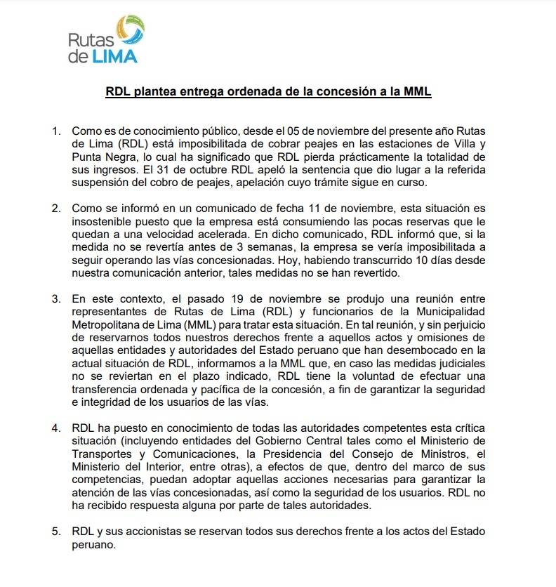 Rutas de Lima (RDL) informó que desde el 5 de noviembre se encuentra impedida de cobrar peajes en las estaciones de Villa y Punta Negra, lo que ha provocado la pérdida de “prácticamente la totalidad” de sus ingresos. La empresa recordó que apeló la sentencia que ordenó esta suspensión; sin embargo, el proceso judicial aún no se resuelve.