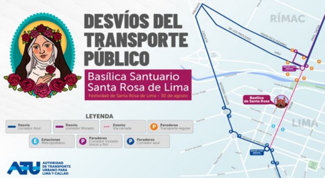 Este viernes 30 de agosto se conmemora el Día de Santa Rosa de Lima, y miles de fieles acudirán a su santuario ubicado en la avenida Tacna, en el Cercado de Lima. La Autoridad de Transporte Urbano para Lima y Callao (ATU) recordó a los usuarios los servicios de transporte público que trasladarán al importante centro religioso.