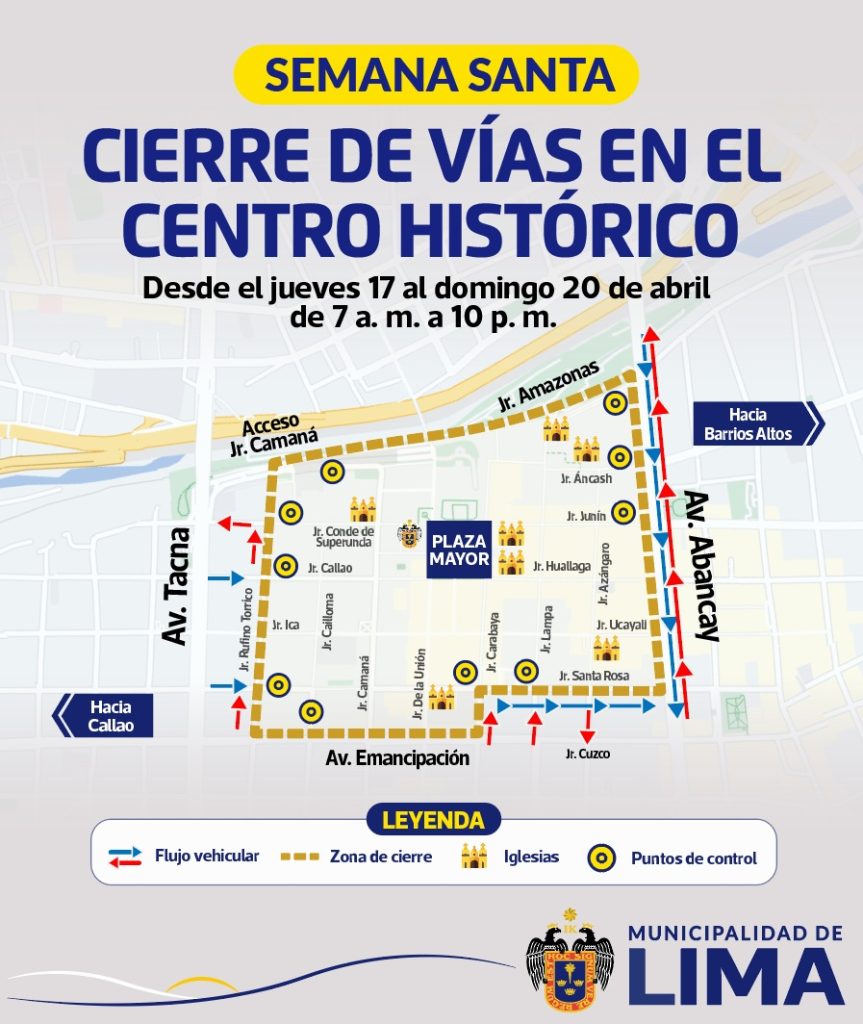 Desde el jueves 17 hasta el domingo 20 de abril, en el horario de 7:00 a. m. a 10:00 p. m., se implementará una zona de restricción en el Damero de Pizarro. Esta área incluye tramos entre la avenida Abancay, el jirón Santa Rosa, jirón Carabaya, jirón Cusco, avenida Emancipación, jirón Rufino Torrico y la ribera del río Rímac.