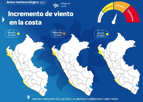 El Servicio Nacional de Meteorología e Hidrología (Senamhi) ha lanzado una alerta meteorológica para advertir sobre la inminente llegada de fuertes ráfagas de viento que afectarán significativamente la costa del Perú. Desde este martes 23 hasta el jueves 25 de abril, siete regiones del país se verán impactadas por este fenómeno climático, según el aviso meteorológico N.° 102 emitido por la institución.
