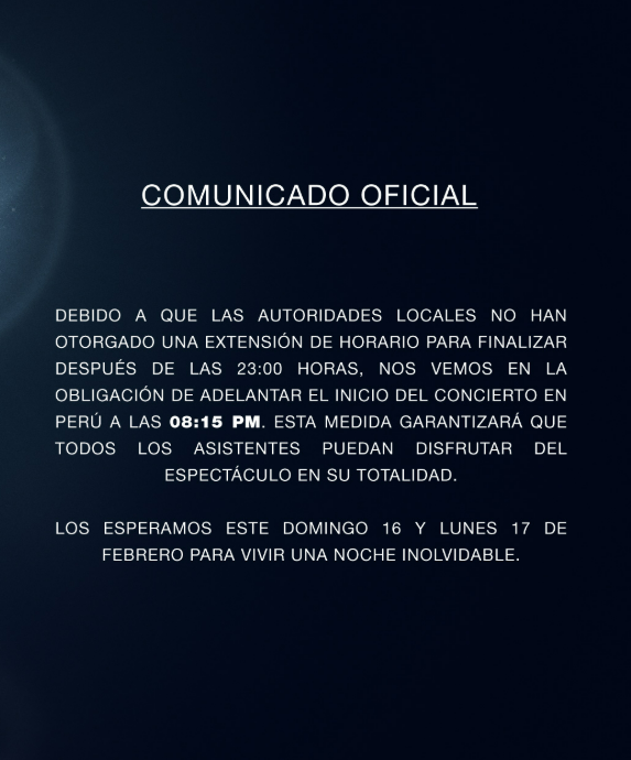 «Debido a que las autoridades locales no han otorgado una extensión de horario para finalizar después de las 23:00 horas, nos vemos en la obligación de adelantar el inicio del concierto en Perú a las 8:15 p.m. esta medida garantizará que todos los asistentes pueden disfrutar de los espectáculos en su totalidad», se lee en el mensaje. «Los esperamos este domingo 16 y lunes 17 de febrero para vivir una noche inolvidable», añaden.