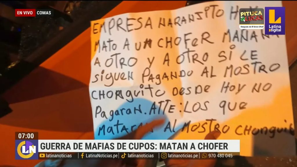 Tras el ataque, los responsables de la muerte de chofer de la empresa de transporte El Mandarino, que llegaron a bordo de una motocicleta al cruce de las av. Tupac Amaru y Revolución, dejaron un manuscrito amenazante como intimidantes.