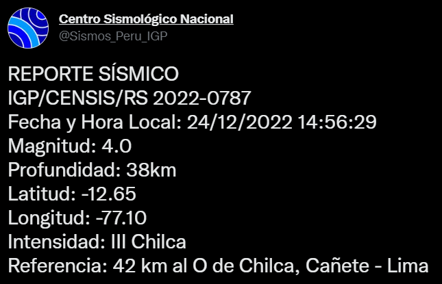 Mantén siempre lista tu mochila de emergencia. Un sismo de magnitud 4.0 se sintió en Lima este sábado 24 de diciembre a las 2:56 p. m. El movimiento telúrico se localizó a 42 kilómetros al oeste de Chilca. Así lo dio a conocer el Instituto Geofísico del Perú (IGP) en Twitter.