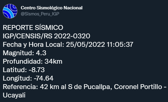 Mantén siempre lista tu mochila de emergencia. Un sismo de magnitud 4.3 se sintió en Ucayali este miércoles 25 de mayo a las 11:05 a. m. El movimiento telúrico se ubicó a 42 kilómetros al sur de Pucallpa. Así informó el Instituto Geofísico del Perú (IGP) en Twitter.