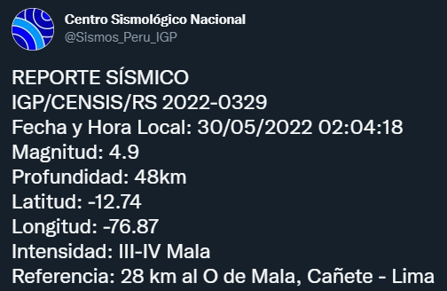 Mantén siempre lista tu mochila de emergencia. Un sismo de magnitud 4.9 se sintió en Lima este lunes 30 de mayo a las 2:04 a. m. El movimiento telúrico se localizó a 28 kilómetros al oeste de Mala. Así informó el Instituto Geofísico del Perú (IGP) en Twitter.