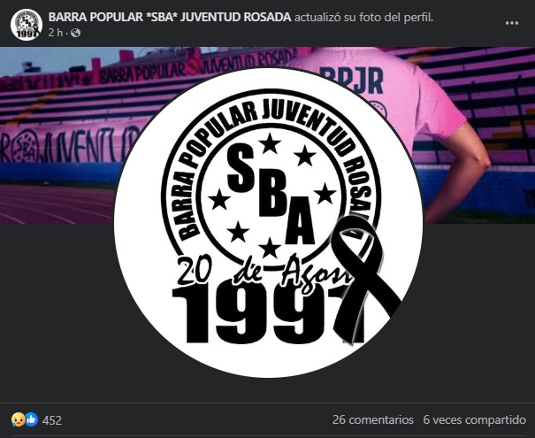 La barra popular Juventud Rosada cambió su foto de perfil y publicó una con el escudo de Sport Boys, en blanco y negro, y con el símbolo de luto.