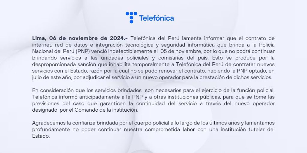 En su comunicado, además, Telefónica explicó que la PNP decidió adjudicar el servicio a un nuevo operador en julio de este año. Esta medida tuvo como consecuencia la nula renovación del contrato.