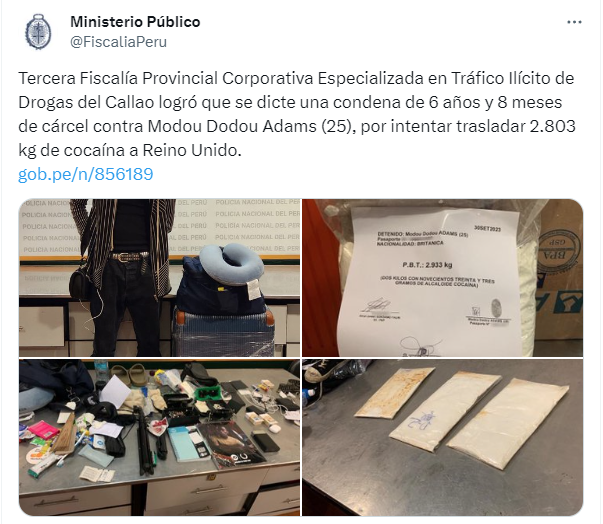“Tercera Fiscalía Provincial Corporativa Especializada en Tráfico Ilícito de Drogas del Callao logró que se dicte una condena de 6 años y 8 meses de cárcel contra Modou Dodou Adams (25), por intentar trasladar 2.803 kg de cocaína a Reino Unido”, informó el Ministerio Público a través de su cuenta oficial X (antes Twitter).