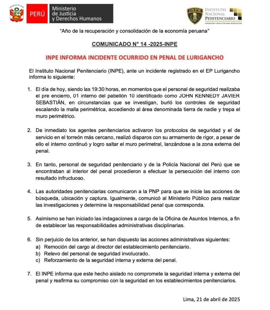 Según el INPE, John logró burlar los controles de seguridad, accediendo a la zona denominada “tierra de nadie” y trepó el muro perimétrico del penal. Pese a la activación de los protocolos de emergencia, Sebastián logró escapar.