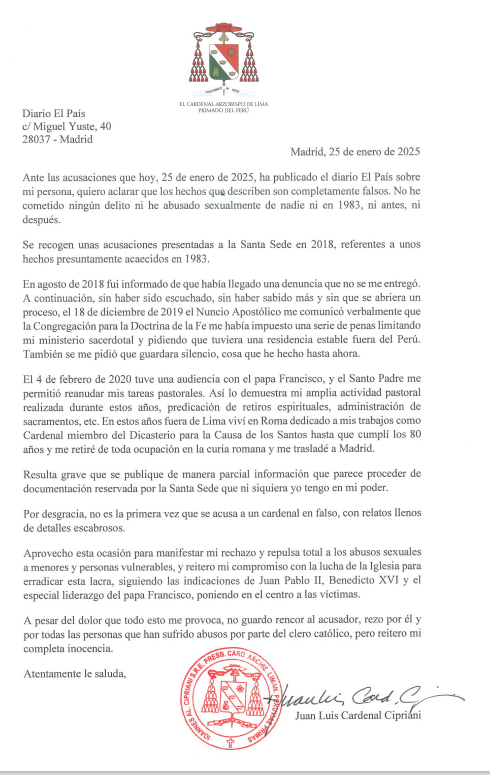 Este sábado 25 de enero, el diario El País difundió un informe en el que señala que el Papa Francisco forzó el retiro del cardenal Juan Luis Cipriani, en 2019, luego de que se conociera una denuncia en su contra por abuso a un menor, quien hoy en día tiene 58 años.