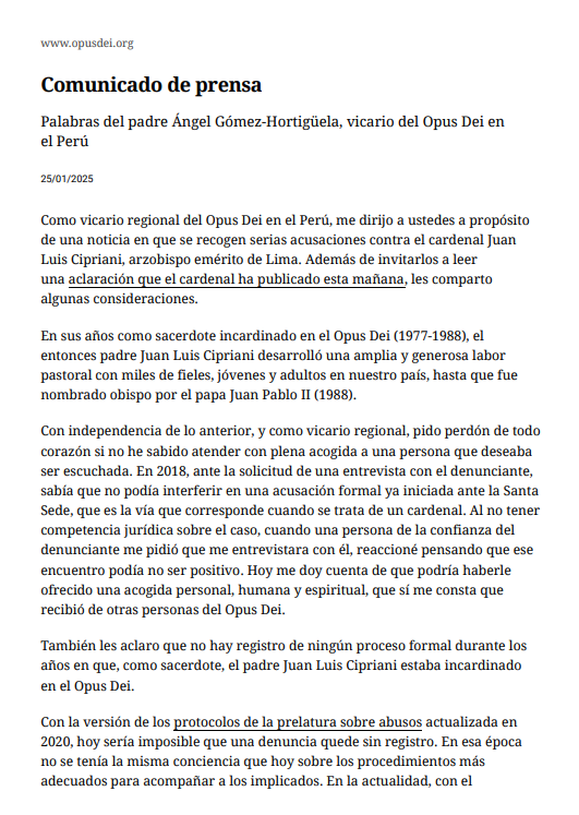 A continuación, el comunicado completo del vicario regional del Opus Dei en el Perú, Ángel Gómez-Hortigüela