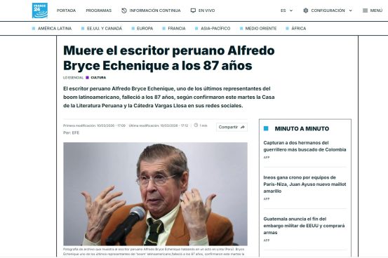 Tras conocerse la noticia, diversos medios internacionales recordaron la trayectoria literaria de Bryce Echenique, autor de novelas, cuentos, ensayos y memorias que marcaron la literatura peruana. El escritor integró, junto a Mario Vargas Llosa y Julio Ramón Ribeyro, una destacada generación de narradores peruanos considerada fundamental para la literatura del país en la segunda mitad del siglo XX.