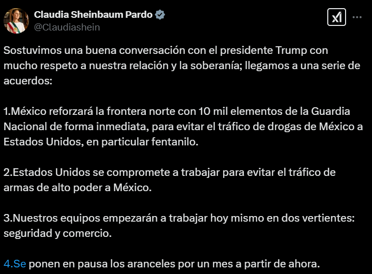 “Sostuvimos una buena conversación con el presidente Trump con mucho respeto a nuestra relación y la soberanía; llegamos a una serie de acuerdos: 1. México reforzará la frontera norte con 10 mil elementos de la Guardia Nacional de forma inmediata, para evitar el tráfico de drogas de México a Estados Unidos, en particular fentanilo. 2. Estados Unidos se compromete a trabajar para evitar el tráfico de armas de alto poder a México. 3. Nuestros equipos empezarán a trabajar hoy mismo en dos vertientes: seguridad y comercio ponen en pausa los aranceles por un mes a partir de ahora. 4. Se ponen en pausa los aranceles por un mes a partir de ahora”, subrayó Sheinbaum.