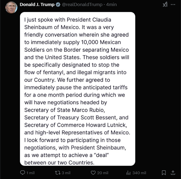 “Acabo de hablar con la presidenta de México, Claudia Sheinbaum. Fue una conversación muy amistosa en la que ella aceptó enviar de inmediato 10.000 soldados mexicanos a la frontera que separa a México de los Estados Unidos. Estos soldados estarán específicamente designados para detener el flujo de fentanilo y de inmigrantes ilegales a nuestro país”, declaró Trump mediante su plataforma Truth Social.