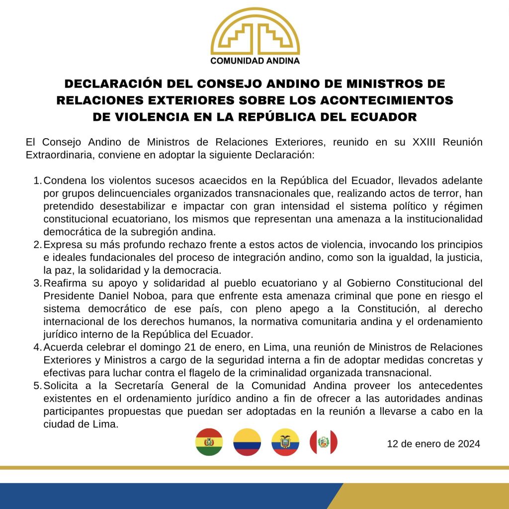 El Consejo Andino de ministros de Relaciones Exteriores, reunido en su XXIII reunión extraordinaria, condenó la ola de violencia en Ecuador causada por organizaciones criminales que “representan una amenaza a la institucionalidad democrática de la subregión andina“.