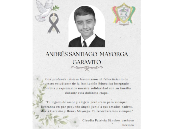 La institución educativa integrado de Cómbita también lamentó la pérdida de su alumno, Andrés Santiago. “Tu legado de amor y alegría perdurará para siempre. Descansa en paz pequeño ángel; junto a tus amados padres“, señaló el colegio.