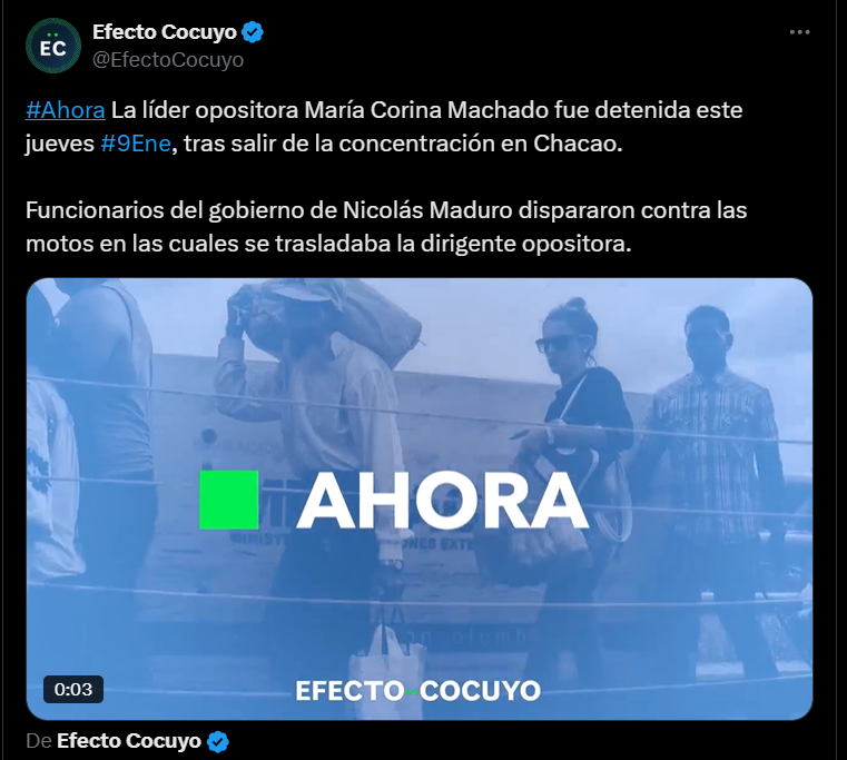 “María Corina (@MariaCorinaYA) fue violentamente interceptada a su salida de la concentración en Chacao. Esperamos confirmar en minutos su situación. Efectivos del régimen dispararon contra las motos que la trasladaban”, reportaron en X el partido Vente Venezuela (VV).