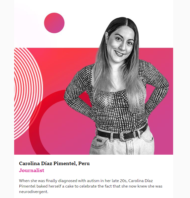 Se trata de Carolina Díaz Pimentel, quien como periodista de profesión cubre temas relacionados a la neurodivergencia y a la salud mental. Enfocada en abordar los problemas que enfrentan las personas con discapacidad.
