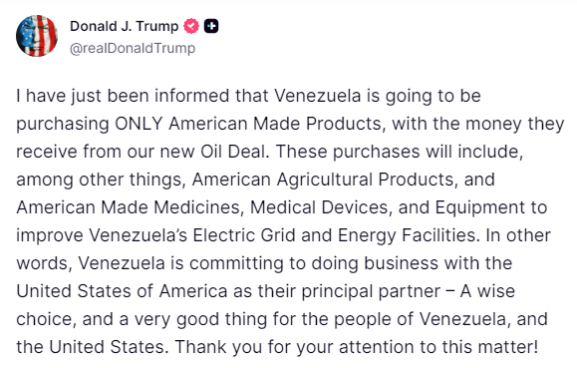 Trump señaló que existe un compromiso de Venezuela para hacer negocios únicamente con Estados Unidos como su principal socio comercial: “ “Venezuela se compromete a comprar solo productos hechos en Estados Unidos con el dinero que reciba de nuestro nuevo acuerdo petrolero”.