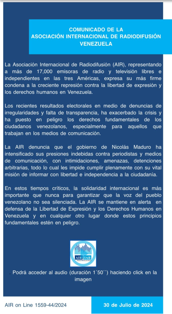La Asociación Internacional de Radiodifusión (AIR) emitió un comunicado tras las elecciones generales que se realizaron en Venezuela donde denuncia que el gobierno de Nicolás Maduro “ha intensificado sus presiones indebidas contra periodistas y medios de comunicación, con intimidaciones, amenazas, detenciones arbitrarias, todo lo cual les impide cumplir plenamente con su vital misión de informar con libertad e independencia a la ciudadanía”