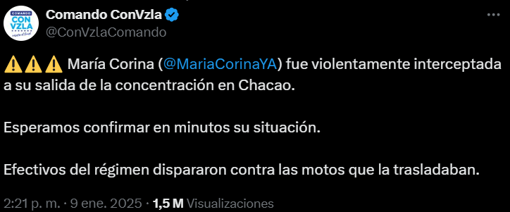 «María Corina (@MariaCorinaYA) fue violentamente interceptada a su salida de la concentración en Chacao. Esperamos confirmar en minutos su situación. Efectivos del régimen dispararon contra las motos que la trasladaban», reportaron en X el partido Vente Venezuela (VV).