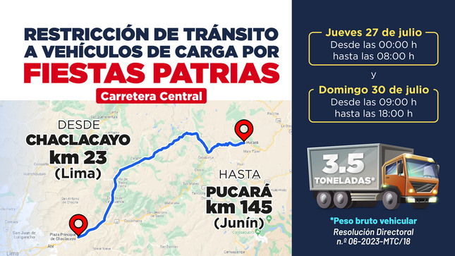 Los vehículos mencionados no podrán circular desde el 27 de julio, entre la medianoche y 8 a.m., en el tramo comprendido entre el kilómetro 23 (Chaclacayo) y el kilómetro 145 (Centro Poblado Pucará, Yauli) de la Carretera Central, en ambas direcciones. Además, el domingo 30 de julio, tendrán restricciones desde las 9:00 a.m. hasta las 6:00 p.m.