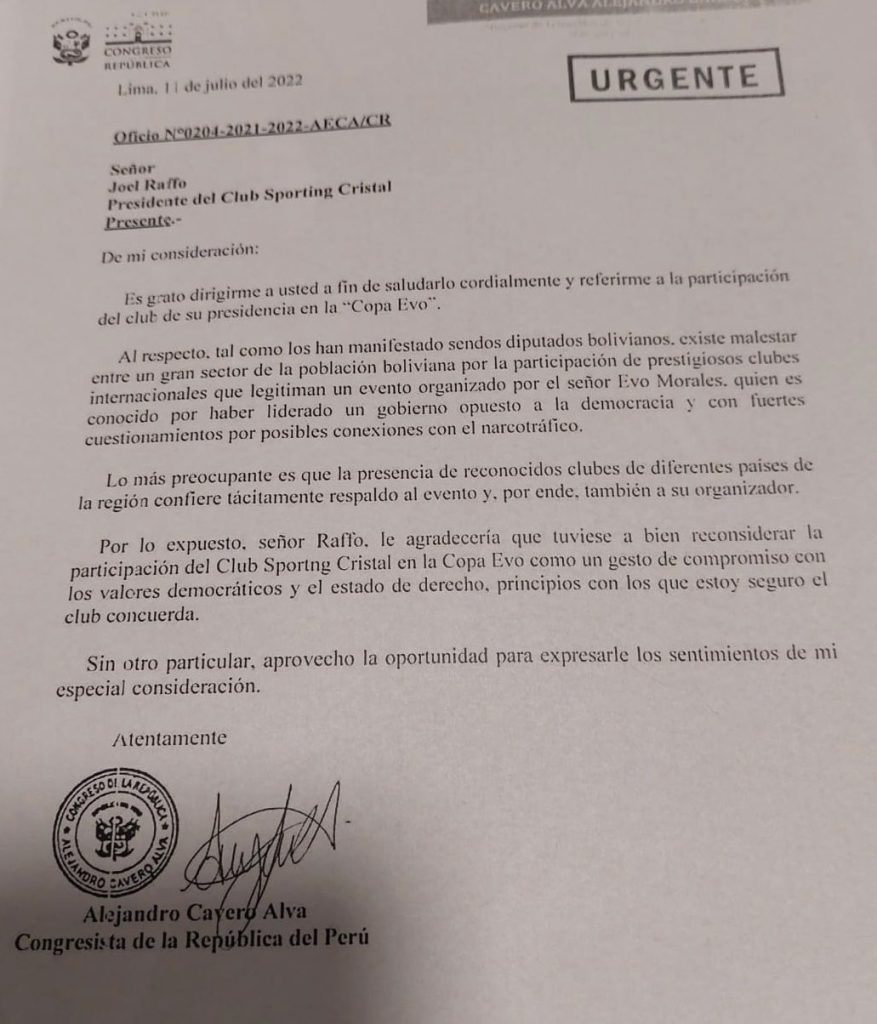 El legislador de Avanza País, Alejandro Cavero, emitió una carta al presidente del club Sporting Cirstal, Joel Raffo, para solicitarle que “reconsidere” la idea de participar en la ‘Copa Evo’, un certamen deportivo que albergará a distintos equipos de la región en la ciudad de Cochabamba, Bolivia.