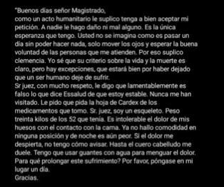 “Peso treinta kilos de los cincuenta y dos que tenía. Es intolerable el dolor de mis huesos con el contacto con la cama (…) Si el dolor me despierta, no tengo cómo avisar (…) Por favor, póngase en mi lugar un día”.