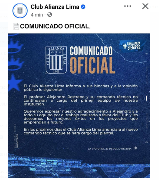 “El club Alianza Lima informa a su hinchada y a la opinión pública lo siguiente: El profesor Alejandro Restrepo y su comando técnico no continuarán a cargo del primer equipo de nuestra institución”, se lee en las primeras líneas