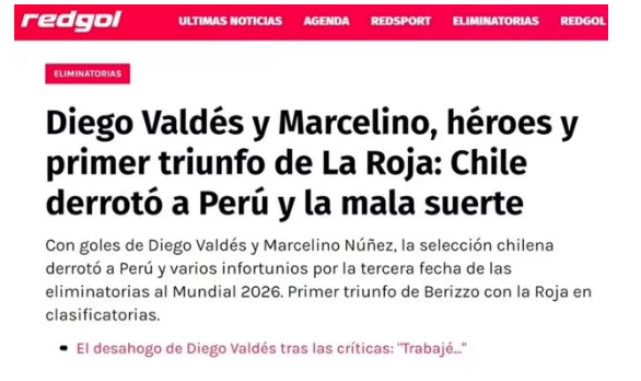 “Diego Valdés y Marcelino, héroes y primer triunfo de La Roja: Chile derrotó a Perú y la mala suerte”, redactaron en RedGol.
