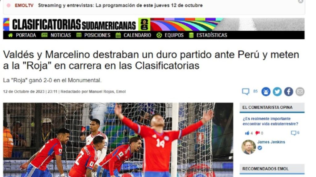 “Valdés y Marcelino destraban un duro partido ante Perú y metes a la ‘Roja’ en carrera en las Clasificatoria”, dijo EmolTV tras el triunfo de la ‘Estrella solitaria’.