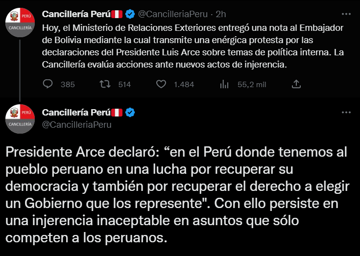 “Hoy, el Ministerio de Relaciones Exteriores entregó una nota al embajador de Bolivia mediante la cual transmite una enérgica protesta por las declaraciones del presidente Luis Arce sobre temas de política interna. La Cancillería evalúa acciones ante nuevos actos de injerencia”, indicaron.