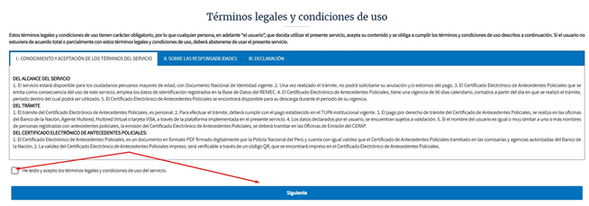 - Paso 4: Se abrirá otra página donde deberás seleccionar el cuadro “He leído y acepto los términos legales y condiciones de uso del servicio” y luego hacer clic en el botón “Siguiente”.