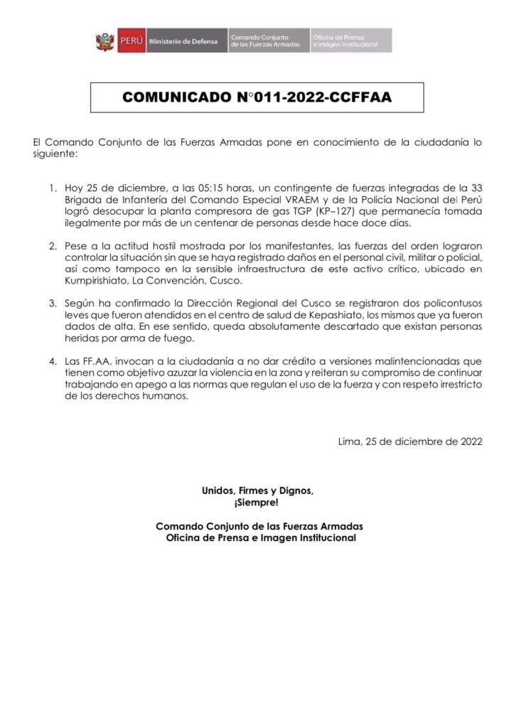 El Ministerio de Salud dio a conocer este domingo 25 de diciembre que dos personas resultaron heridas tras un enfrentamiento entre manifestantes y personal de las Fuerzas Armadas. El incidente se produjo en la planta de gas ubicada en Kepashiato, en la provincia de La Convención, Cusco.