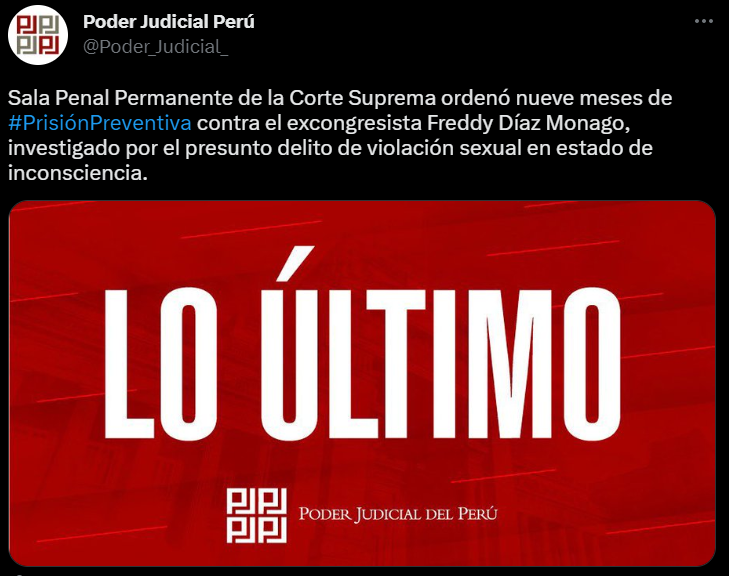 El Poder Judicial impuso nueve meses de prisión preventiva para el excongresista Freddy Díaz Monago, quien se encuentra bajo investigación del Ministerio Público por el presunto delito de violación. Por este hecho, el Congreso aprobó su desafuero e inhabilitación por diez años.