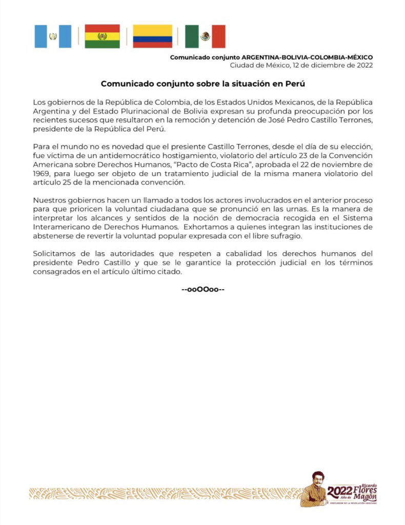 Los Gobiernos de Argentina, Colombia, México y Bolivia emitieron un comunicado conjunto, en donde reconocen a Pedro Castillo como presidente del Perú. En medio de la coyuntura política y social, dichos países mostraron su preocupación por los recientes sucesos.