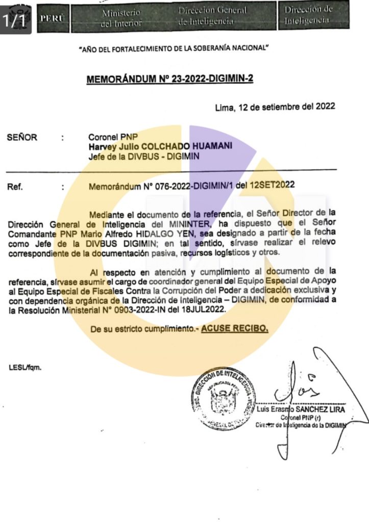 En el documento dirigido a Colchado, se le informa que su reemplazo será el comandante PNP Mario Alberto Hidalgo Yen, por lo que se le solicita al coronel “realizar el relevo correspondiente de la documentación pasiva, recursos logísticos y otros”.