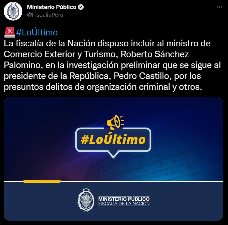 A través de su cuenta de Twitter, la Fiscalía dio a conocer que Sánchez, congresista de Juntos por el Perú y titular del Mincetur desde que se inició el Gobierno de Pedro Castillo, será investigado por el delito de obstrucción a la justicia en calidad de autor.